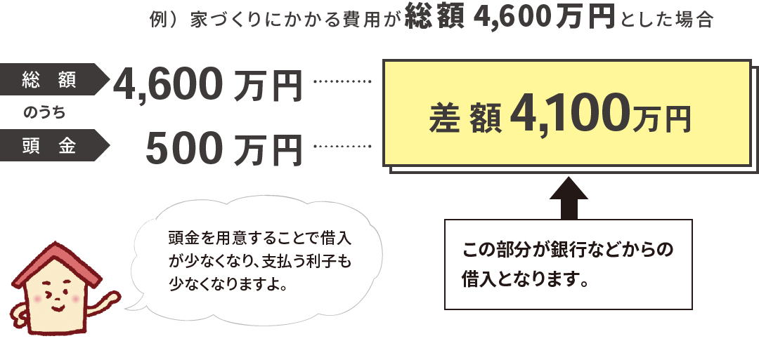 家づくりにかかるお金は「家」の価格だけではありません。例のように、他にも「土地」、「諸経費」の費用がかかります。
